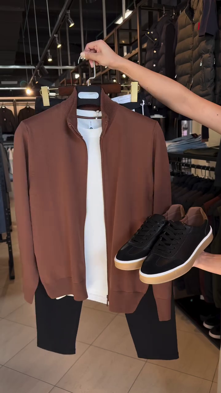 The Brown Calvin Klein Zip-Up is for the man who wants the comfort of a sweater but the silhouette of a tailored jacket. It is a “power basic”—uncomplicated, versatile, and finished with the prestige of an iconic American house.