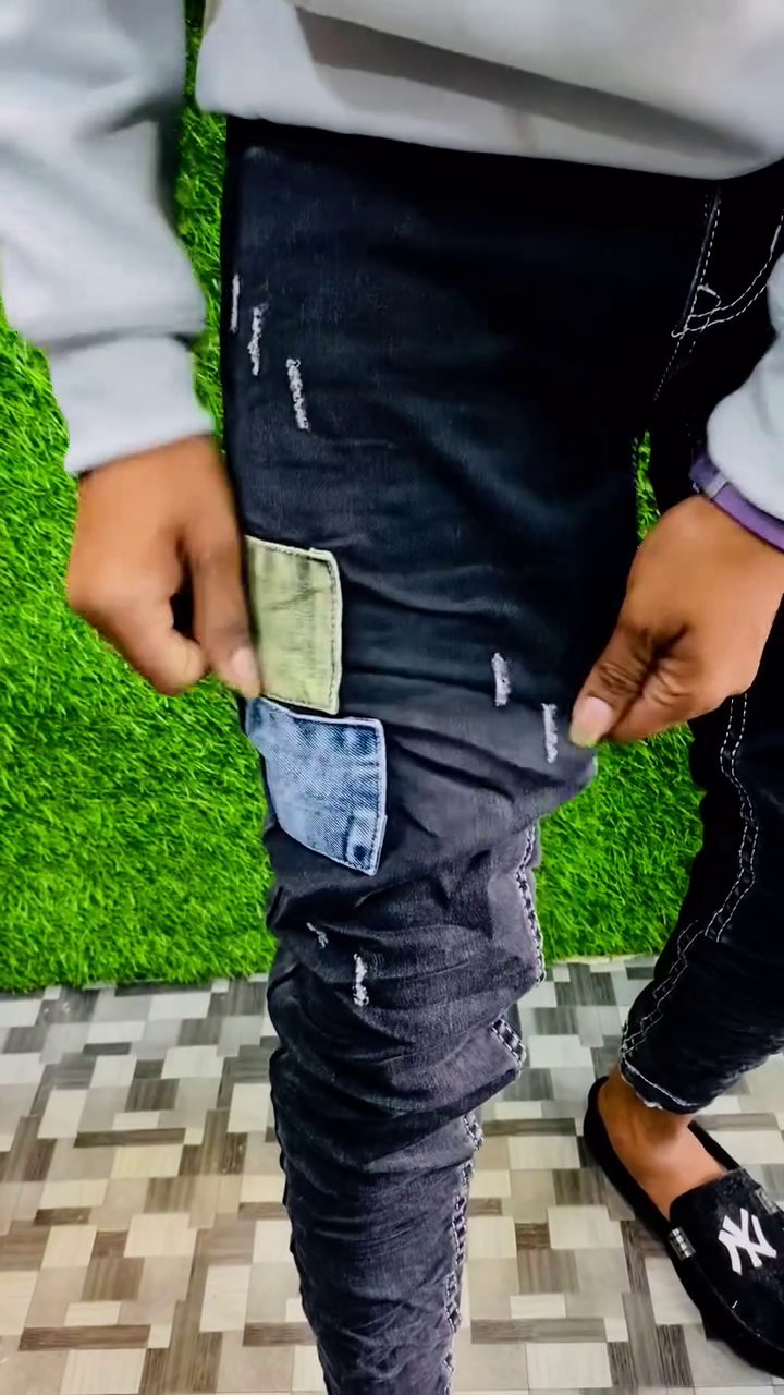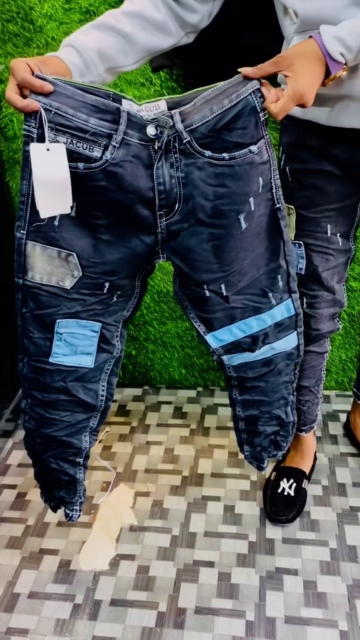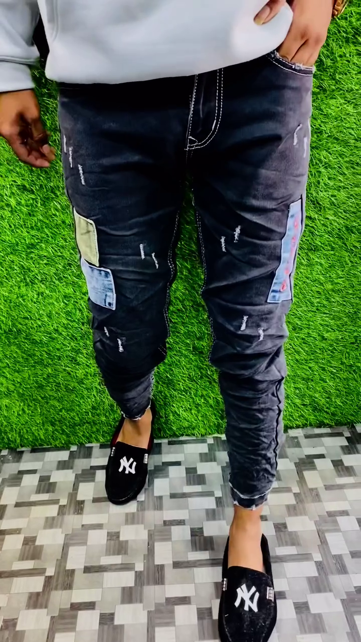 The distressed detailing and unique patchwork design give the jeans a trendy urban vibe, making them ideal for casual outings, parties, and weekend wear. The slim fit cut enhances the overall silhouette while ensuring comfort and easy movement throughout the day.