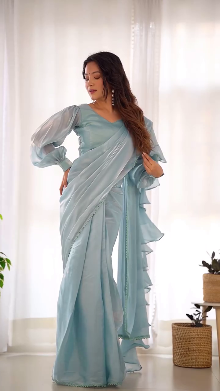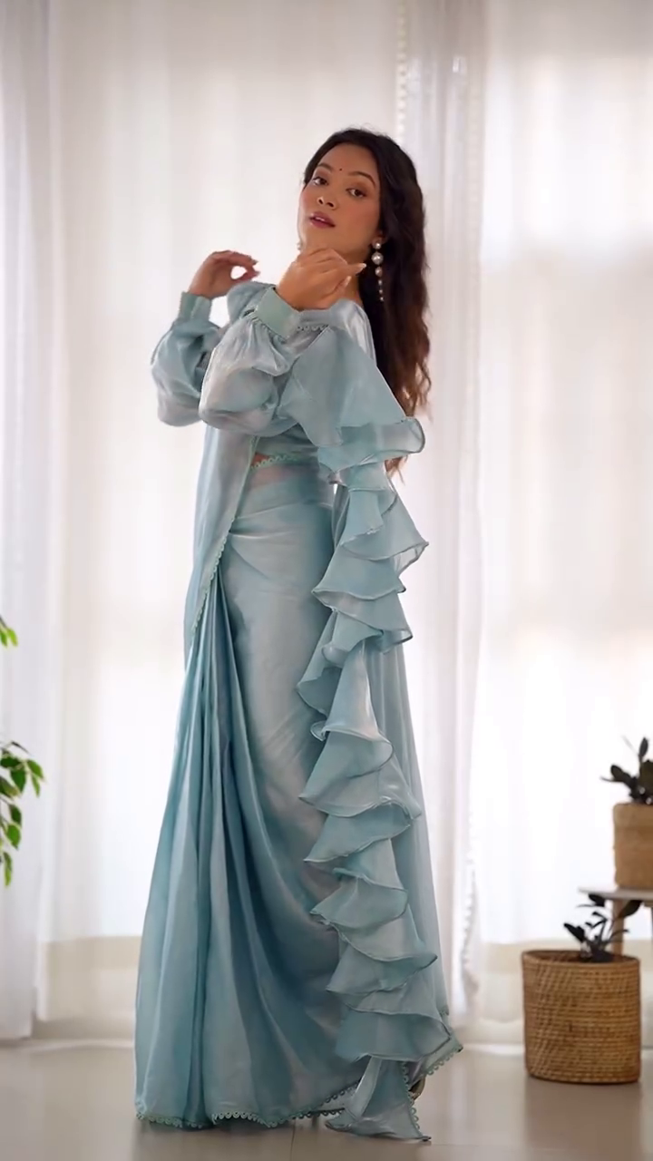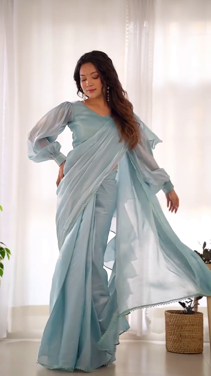 Ready to Wear Solid/Plain Bollywood Organza Saree (Blue)